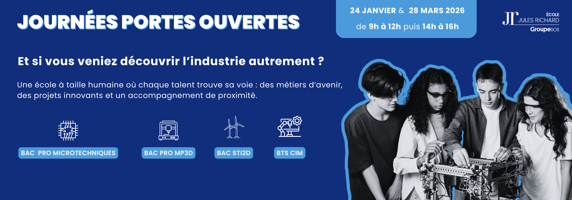 À l’École Jules Richard, nous formons les jeunes aux métiers techniques et industriels d’aujourd’hui et de demain, dans un cadre bienveillant, exigeant et profondément humain. Nos portes s’ouvriront à toutes les familles les :